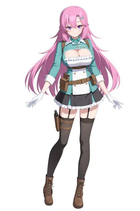 black thighhighs,frills,white gloves,holster,asymmetrical legwear,black thighhighs,cleavage cutout,aqua jacket,pouch,blue jacket,black skirt,clothing cutout,brown footwear,belt pouch,garter straps,cross-laced footwear,