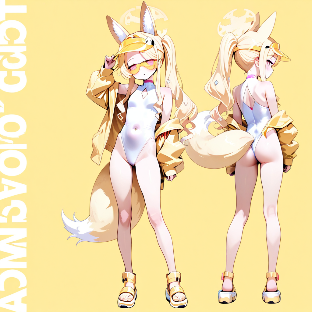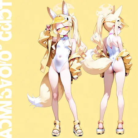 SeiaSW,pink eyes,blonde hair,long hair,ponytail,halo,fox ears,fox tail,