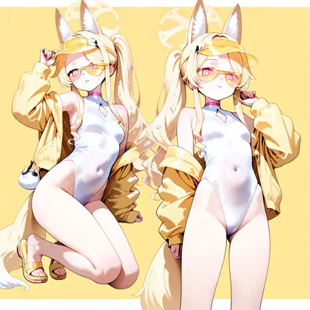 yellow visor,tinted eyewear,sunglasses,white one-piece swimsuit,highleg one-piece swimsuit,diamond cutout,covered navel,yellow jacket,yellow sandals,