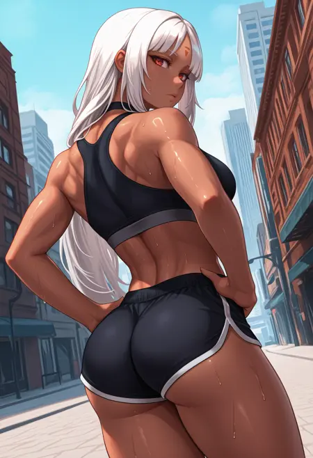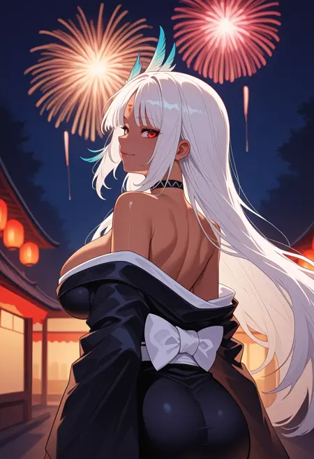 默认服装: m4ssdef, 深色皮肤女性, 额头标记, 长发, 白发, 羽毛发饰, 红眼, 黑色夹克, 部分开拉链, 露肩, 长袖, 黑色比基尼, 仅上装, 黑色短裤, 短裤, 大腿带, 黑色项圈, 裸露肩部, 锁骨, 大胸