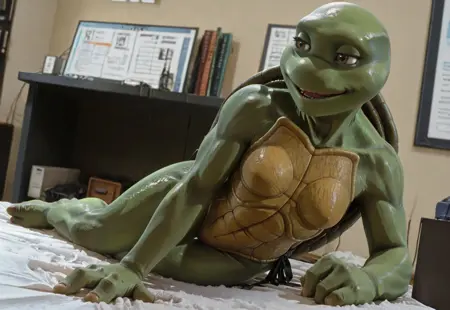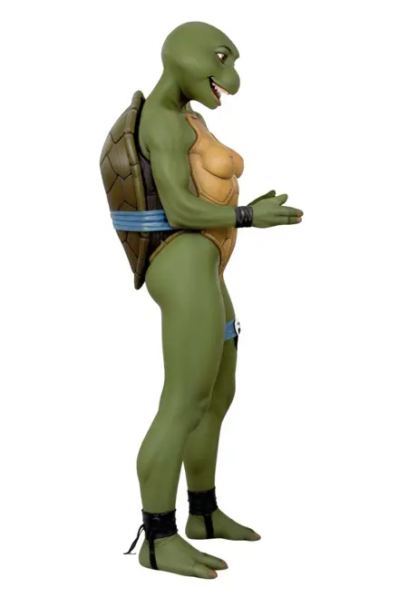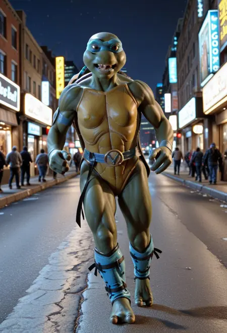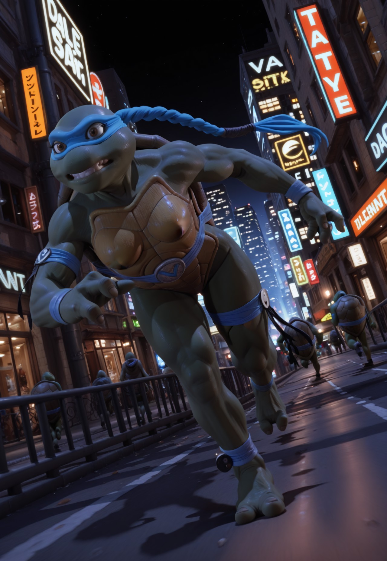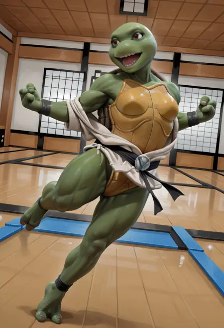 Tags: anthro turtle, tmnt, green skin, bron eyes, plastron, turtle shell, blue mask, cloth braid, blue shinguards, 3fingers, 2toes