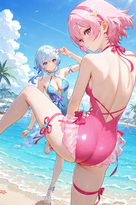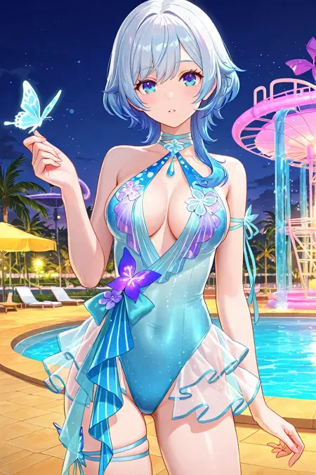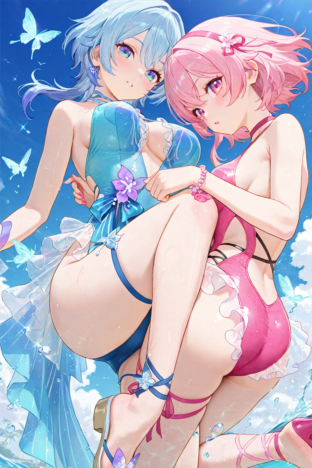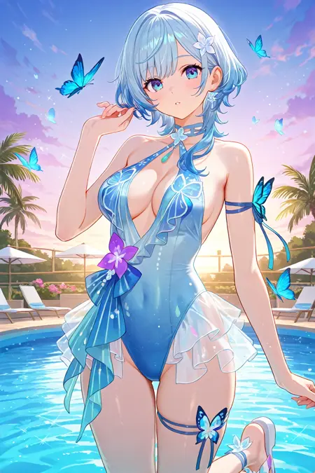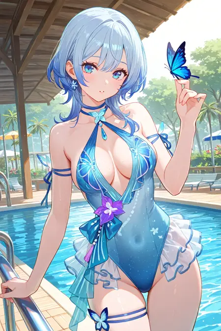 触发词(Trigger word)****:breasts,blue dress,arm ribbon,butterfly,flower,halterneck,leg ribbon,leotard,one-piece swimsuit,ribbon,sandals,see-through,sideboob,thigh strap,