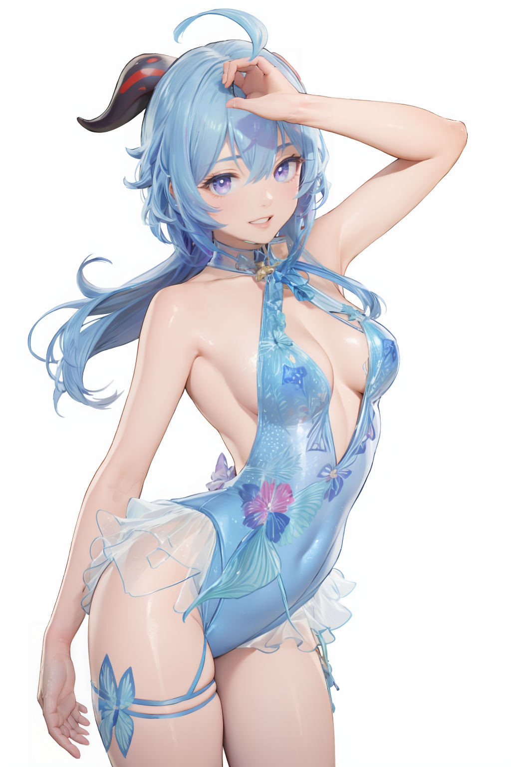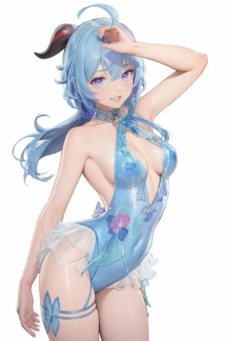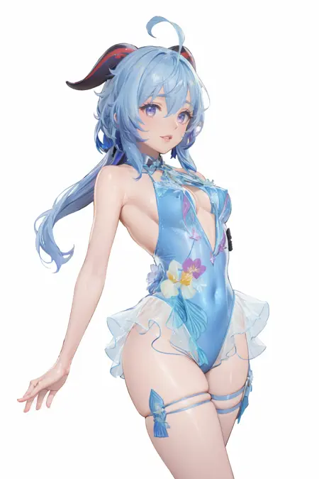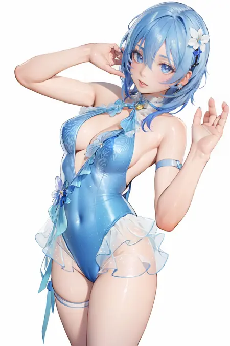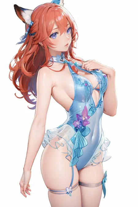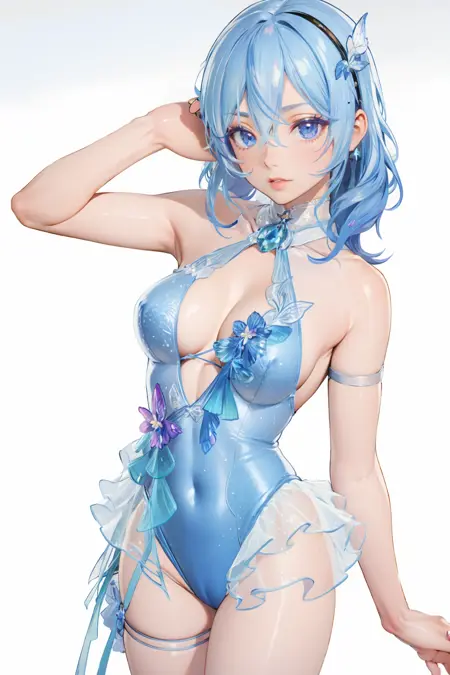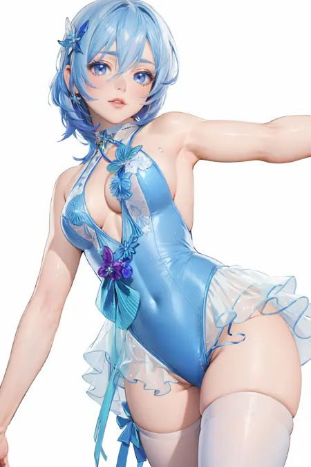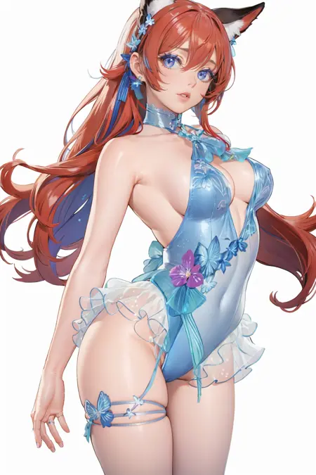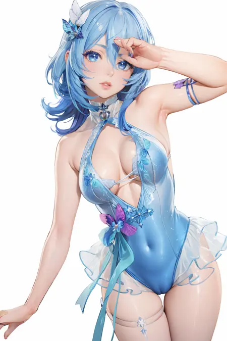 트리거 단어(Trigger word)****:breasts,blue dress,arm ribbon,butterfly,flower,halterneck,leg ribbon,leotard,one-piece swimsuit,ribbon,sandals,see-through,sideboob,thigh strap,