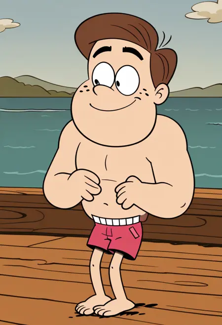 Swuimsuit: jack lumber, solo, 1boy, brown hair, black eyes, freckles, buff, swimwear, pink shorts, barefoot