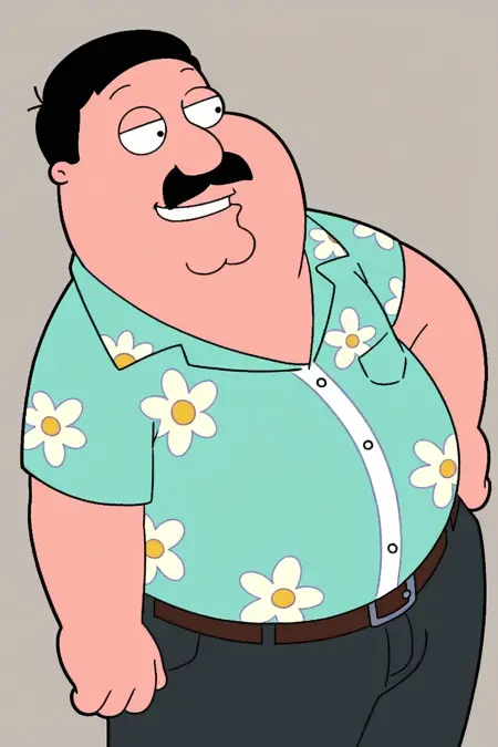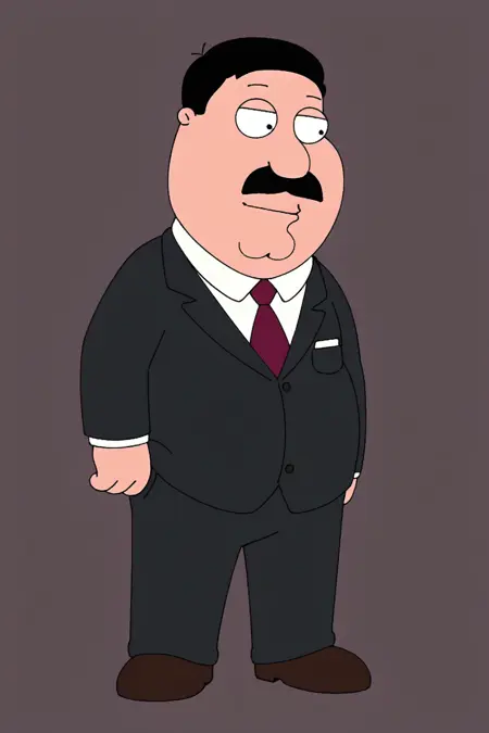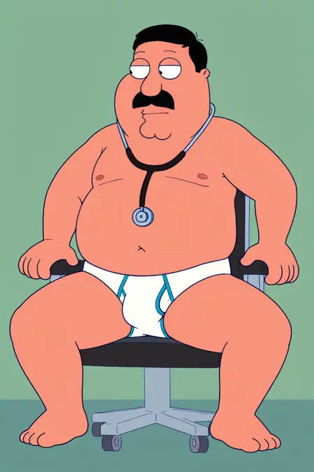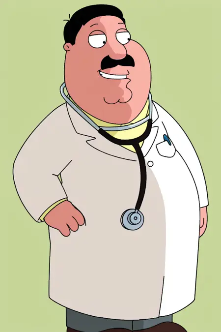 masterpiece, very awa, best quality,Family Guy style,1boy,solo,fat, old man,Drhartman,black hair,moustache,labcoat,stethoscope