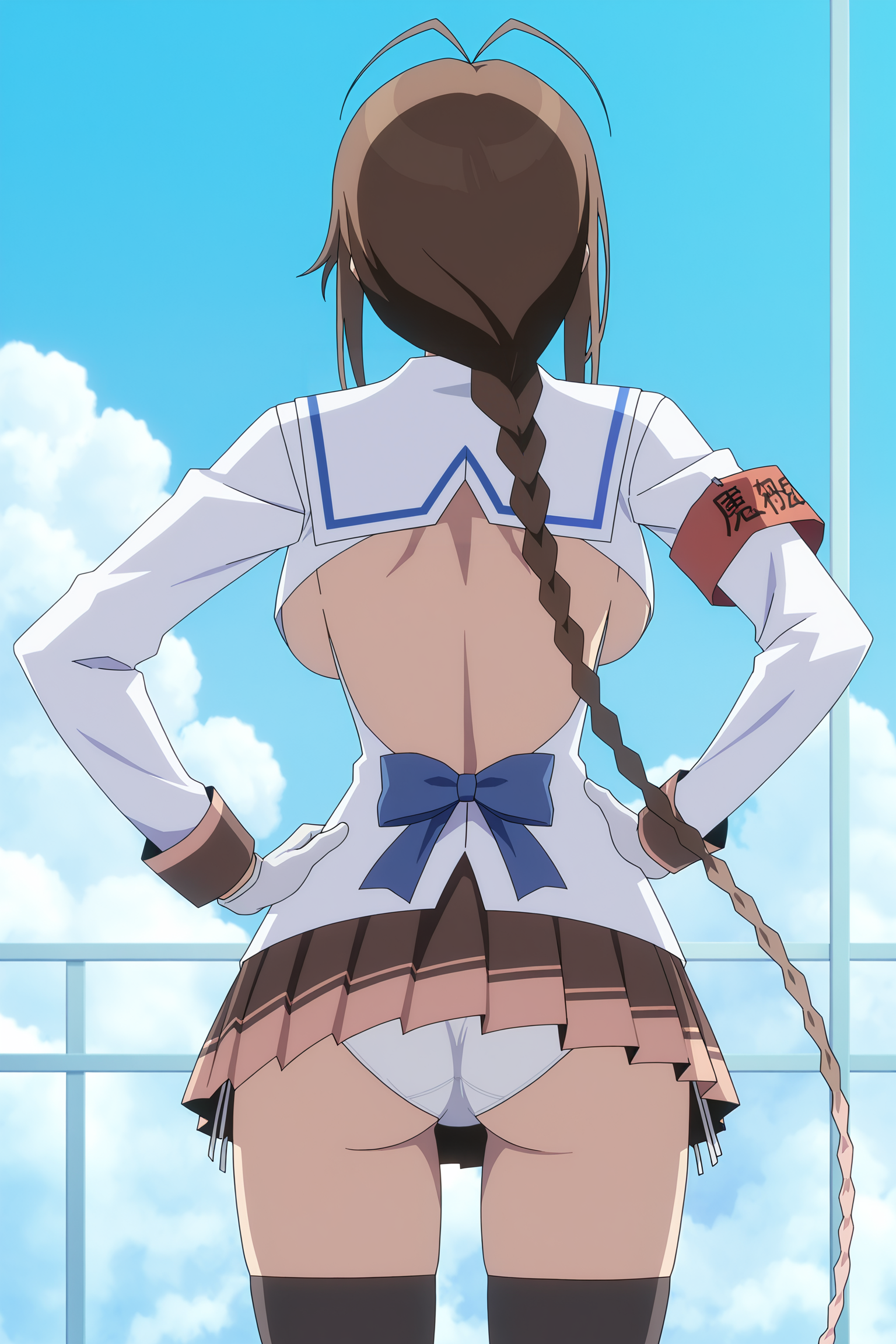 pleated skirt,black thighhighs,armband,hairclip,white gloves,bandeau,white bra,black skirt,brown skirt,open clothes,white footwear,white shirt,blue ribbon,miniskirt,