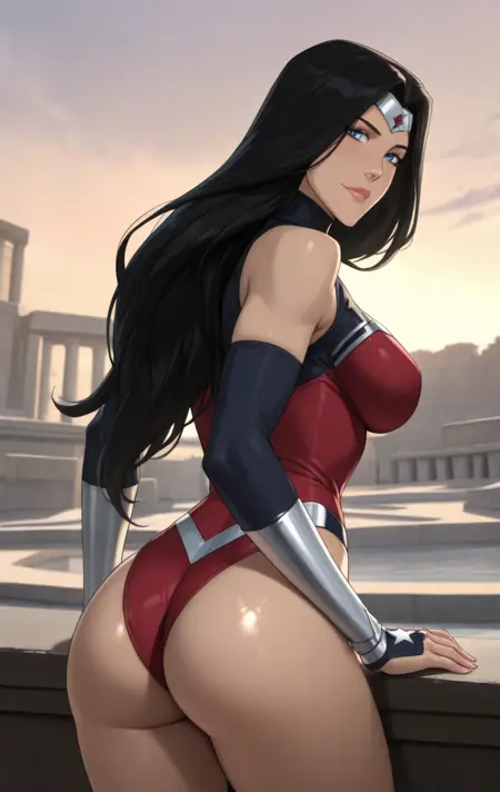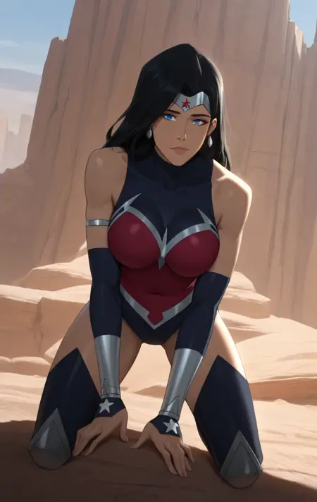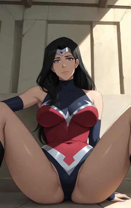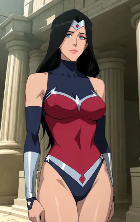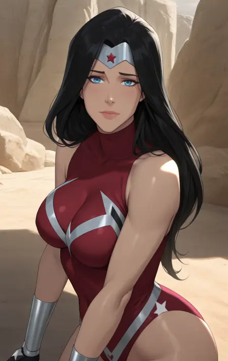 ,1girl, solo,long hair, breasts, looking at viewer, blue eyes, black hair, gloves, bare shoulders, medium breasts, blue eyes, cowboy shot, leotard,red armor, colored sclera, turtleneck, covered navel, highleg, gem, muscular,wwBl00d,