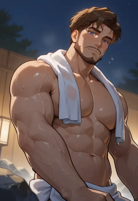 blue eyes, facial hair, brown hair, blue jumpsuit with red accents, black gloves, black boots