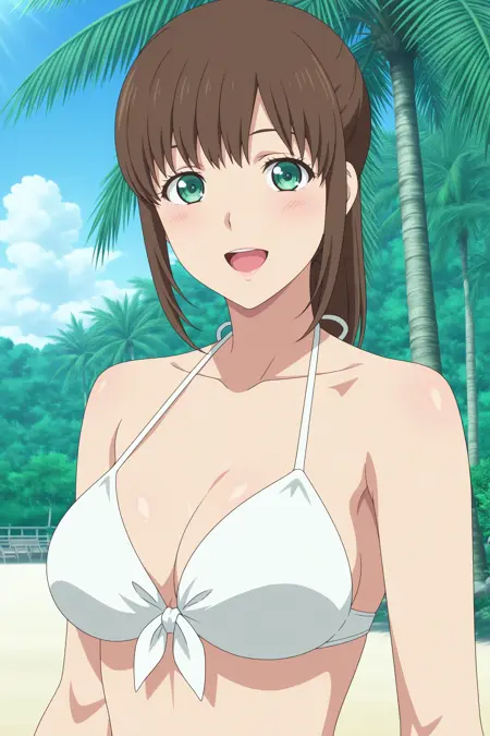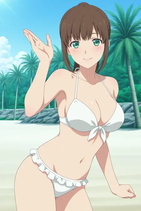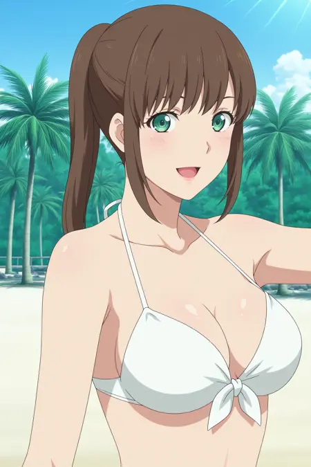 tachibana hina, 长发, 棕发, 马尾, 侧发, 不齐刘海, 绿眼睛, 白色比基尼, 荷叶边比基尼