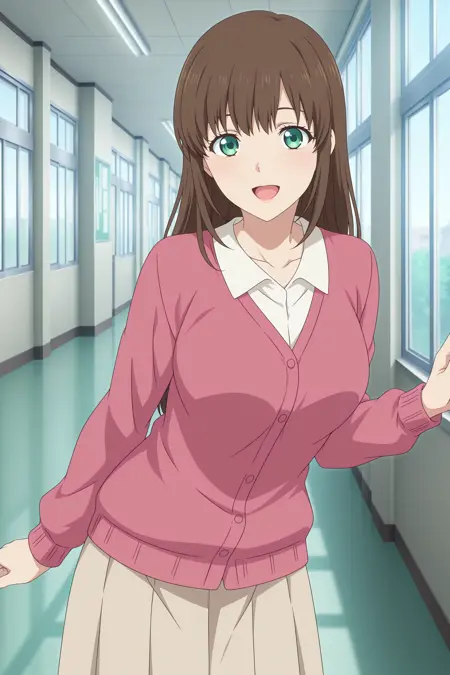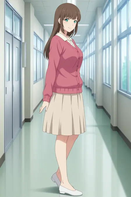 tachibana hina, 长发, 棕发, 侧发, 不齐刘海, 绿眼睛, 长袖, 粉色开衫, 白色衬衫, 有领衬衫, 不塞进裤子的衬衫, 棕色衬衫, 中长衬衫, 白色鞋子, 平底鞋