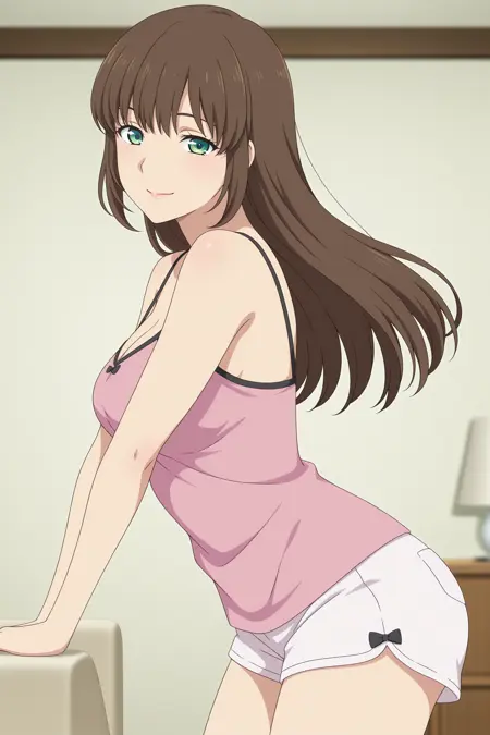 tachibana hina, 长发, 棕发, 侧发, 不齐刘海, 绿眼睛, 粉色吊带背心, 细肩带, 黑色肩带, 白色短裤, 超短裤, 海豚短裤