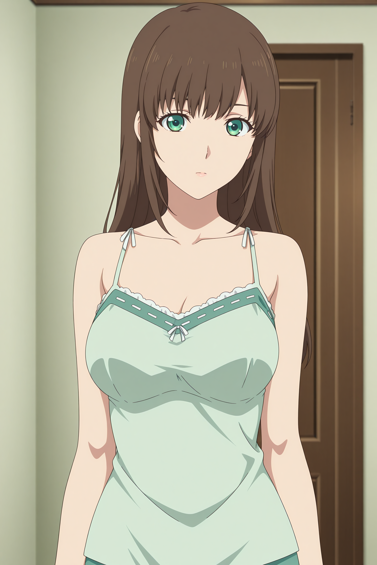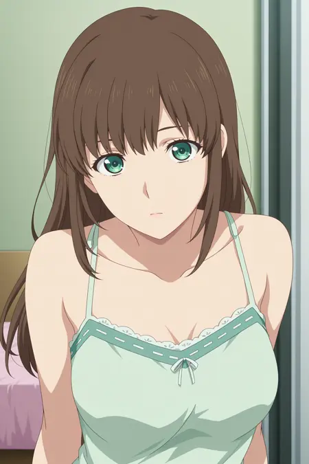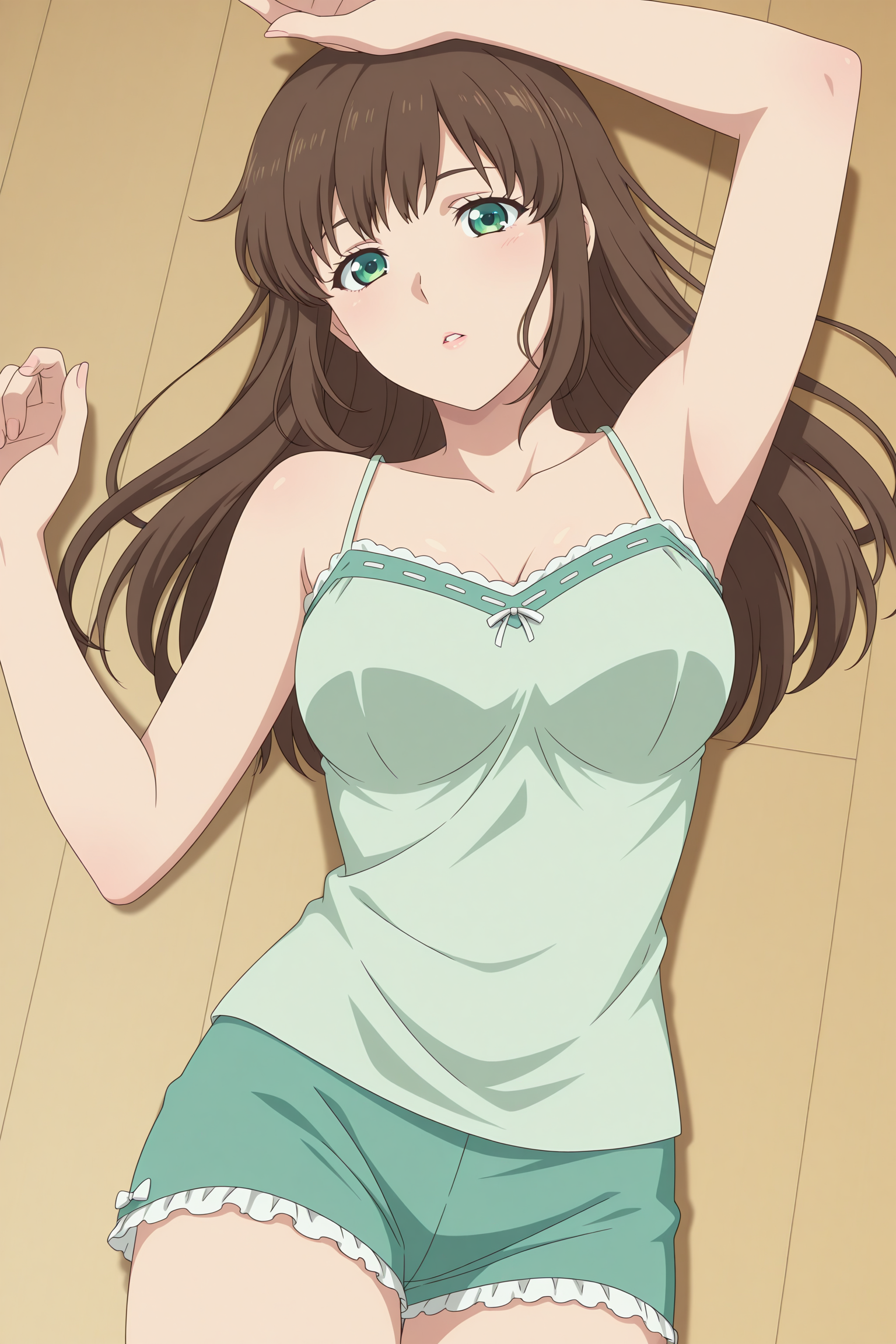 tachibana hina, 长发, 棕发, 侧发, 不齐刘海, 绿眼睛, 绿色吊带背心, 细肩带, 绿色短裤, 超短裤, 蕾丝边短裤