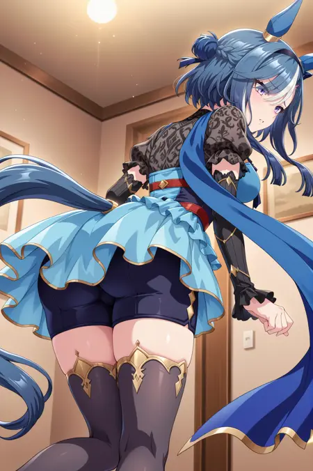 경주복… 하이힐, 흰 신발, 빨간 넥타이, 가터 스트랩, 검은 투어하이, 가슴 노출, 파란 드레스, 볼륨 있는 소매, 파란 망토, 줄리엣 소매, 쇼츠, 프릴, 검은 쇼츠