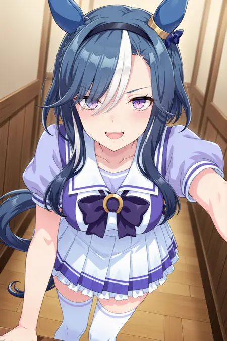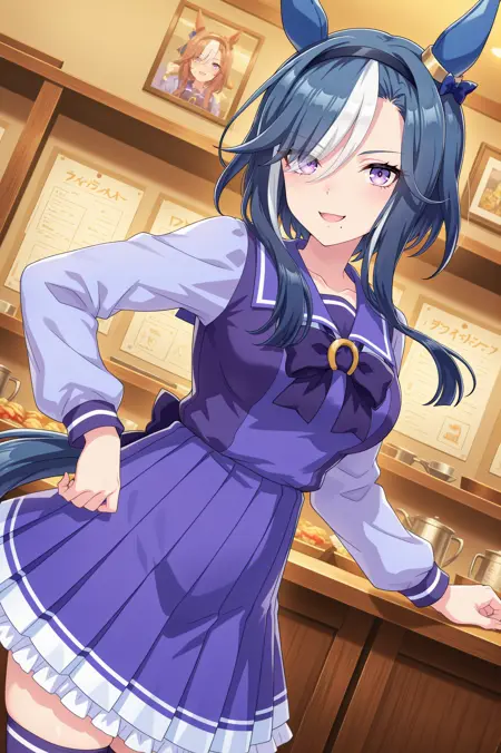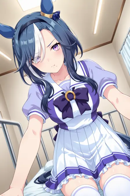 just in case... umamusume, animal ears, horse ears, horse girl, solo, blue hair, purple eyes, multicolored hair, hair bun, ear covers, ear bow, medium breasts, white hair, two-tone hair, streaked hair, ear ornament, black hairband, medium hair, mole under mouth, blue bow, short hair with long locks, eyes visible through hair, hair over one eye,