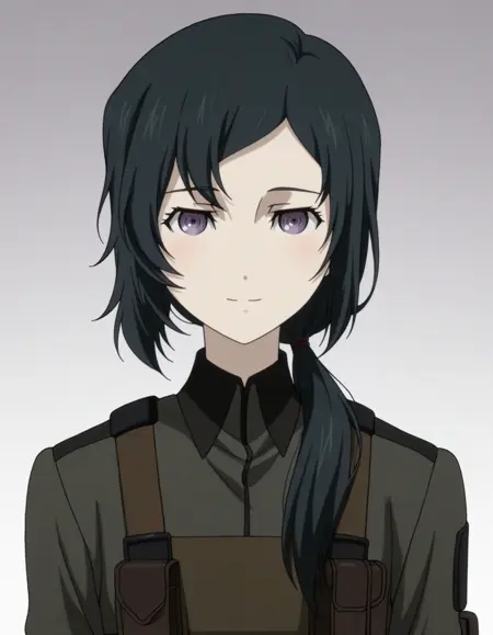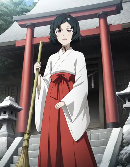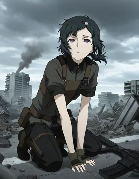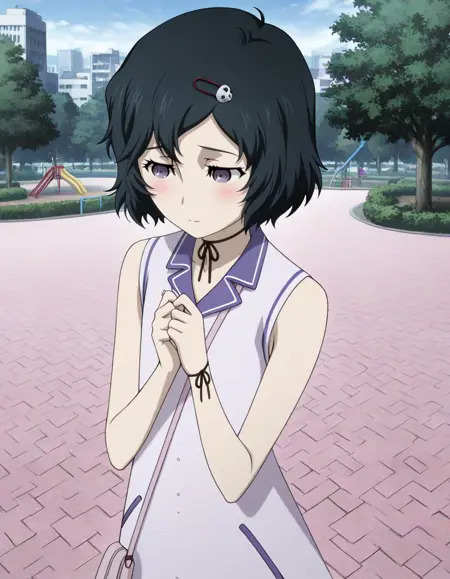<lora:ruka_urushibara-steins_gate_mov-v2-ixl-anime-soralz:1>, 루카 우루시바라(스테인즈 게이트), 단발, 검은 머리, 두개골 모양 머리 장식, 보라색 눈