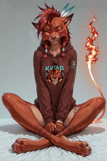 Red XIII, 털이 많은, 앤트로/페럴(하나 선택), 불타는 꼬리 끝, 붉은 털, 부족 문양, 날카로운 발톱, 송곳니, 긴 털 mane, 깃털, 머리 장식