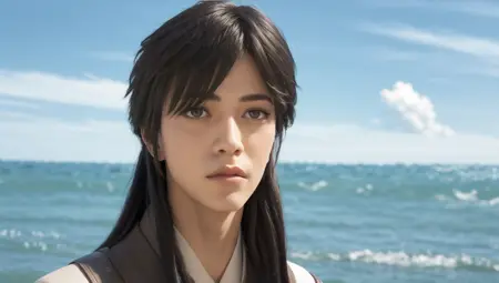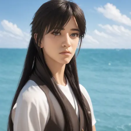 一个年轻男子,留着长长的黑发,穿着背心,站在海洋前,天空湛蓝,(1girl:0.955), (刘海:0.575), (黑眼睛:0.572), (黑发:0.709), (蓝天:0.985), (闭嘴:0.536), (云:0.927), (白天:0.980), (地平线:0.816), (和服:0.511), (嘴唇:0.764), (长发:0.775), (注视着观众:0.811), (鼻子:0.534), (海洋:0.950), (户外:0.734), (写实:0.814), (天空:0.988), (单独:0.937), (上半身:0.557), (水:0.600)