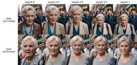 저의 "눈물 흘리며 울기" LoRA와 마찬가지로, 기본 SDXL의 "화난" 표현은 대부분의 경우 매우 화난 듯 보이지 않습니다. 이 LoRA는 그 문제를 개선하는 데 도움이 됩니다. 이 LoRA는 여성만으로 학습되었지만, 남성에게도 잘 적용됩니다.