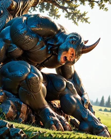 giant, human face, male, two horns, gray skin, wart-like growths on skin, thick skin, polymer skin coating, sculpted muscles, polymer growths, bald, brown eyes, hooves on feet,