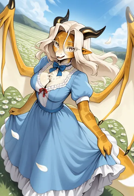 始终需要的标签:"龙族女孩、怪物女孩、多色皮肤、黄色皮肤、白色皮肤、鳞片、龙角、黑色角、胸部绒毛、吻部、喙、尖耳朵、彩色眼睫毛、铂金色眼睫毛、铂金色眼睛、竖瞳、长发、铂金色头发、发丝遮眼、眼睛间的头发、爪子、中等大小胸部、蜥蜴尾巴、黄色尾巴、龙翼、黄色翅膀、双色翅膀、白色翅膀、黑色尖刺、皮肤獠牙" —— 为确保准确性,这些标签必须始终包含。