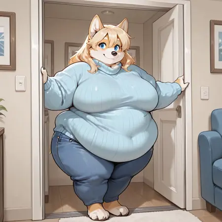Heather(character), female, chubby, obese, dog, anthro, furry, blonde, blue eyes,