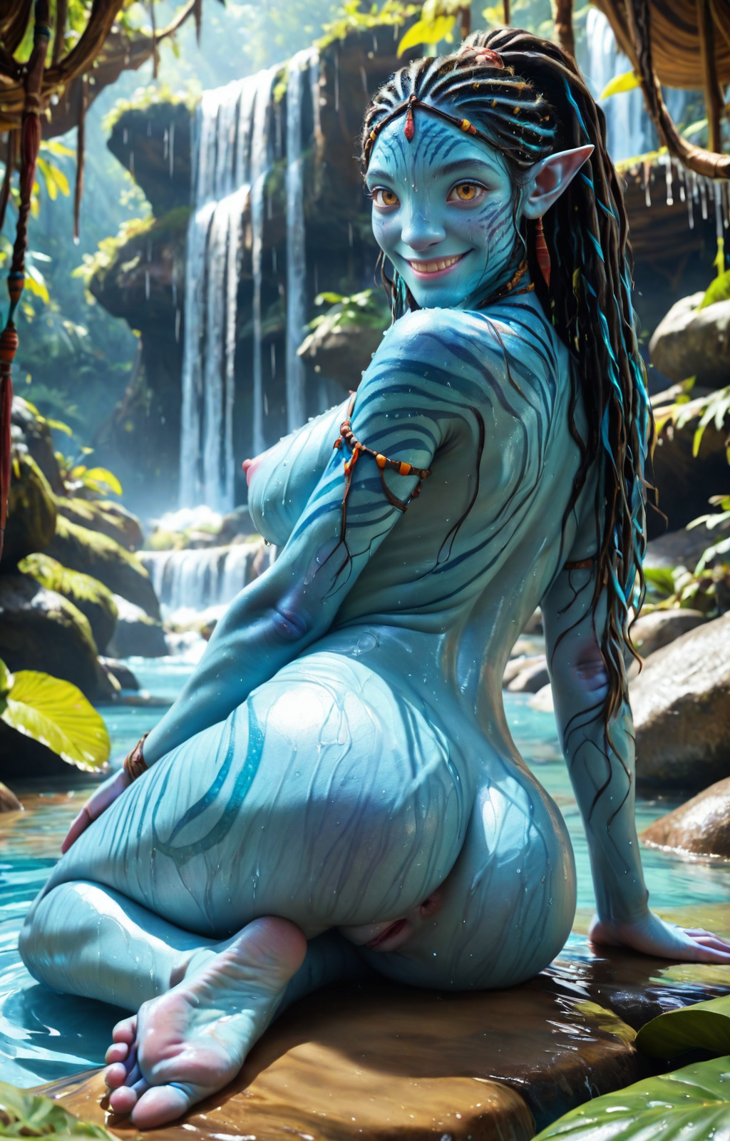 iltsireya, 1girl, ass, pussy, tribal, solo, anus, uncensored, waterfall, long hair, barefoot, colored skin, outdoors, bodypaint, wet, nude, looking back, from behind, facepaint, blue skin, water, black hair, smile, braid, facial mark, breasts<lora:illustrious Tsireya 02 1024X1600:0.8>, elf ears, blue soles