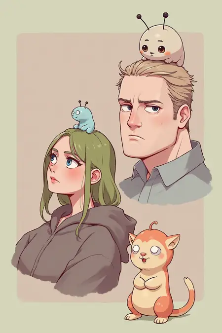 头上带有小生物的角色,柔色调背景,简约而富有表现力,生物增添魅力,人类服装颜色统一,和谐整体感。