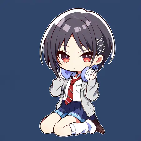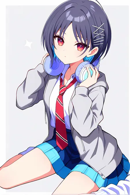 mashiroyu、赤い目、黒髪、1人女の子、首にヘッドフォン、ネクタイ、グレーのジャケット、短い髪、赤いネクタイ、xの髪飾り、ジャケット、白いシャツ、学校の制服、プリーツスカート、青いスカート,