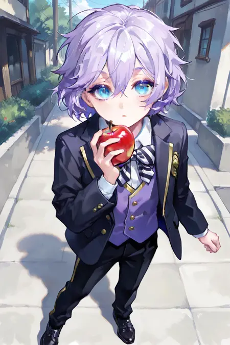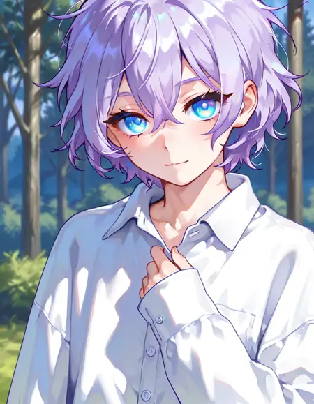 注意:彼の外見については、以下のプロンプトのように記述できます:1boy、epel felmier、情緒豊かな青い目、白い肌、柔らかい男性の顔立ち、紫のまつげ、ラベンダーパープルの髪、前髪、乱れた髪、肩までの髪長さ、