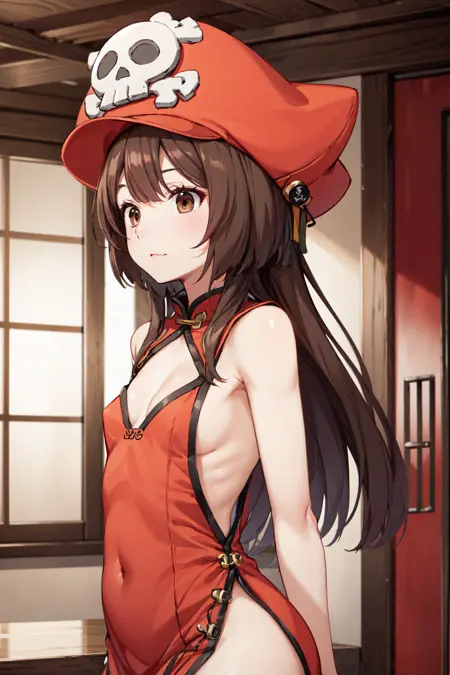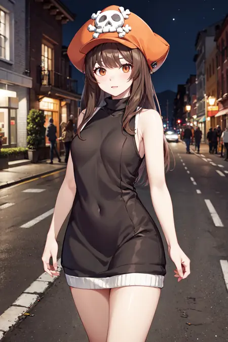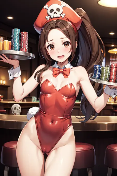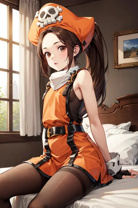 - bbmay, 해적 모자, 두개골과 뼈, 갈색 눈, 긴 머리, 작은 가슴, (오렌지색 셔츠:1.2), 소매 없음, 허리 노출, 손가락 없음 장갑, 바지, 말아 올린 바지, 벨트, 발목 부츠
