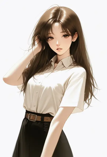一种半写实、略带朦胧感的艺术风格。衣物和头发等纹理极其逼真,整体色调低饱和、具有“纪实”美学,若你能理解的话。