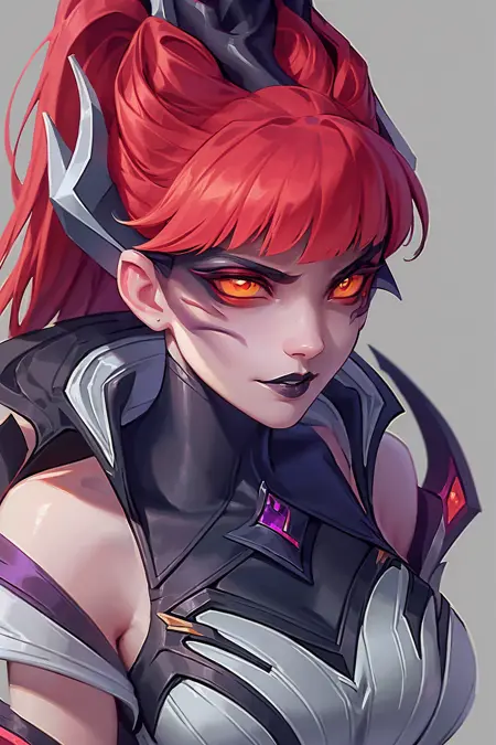 Other prompts : 1girl, yellow eyes, red sclera, red hair, long hair, ponytail, bang, purple lips, grey dress, thighhighs