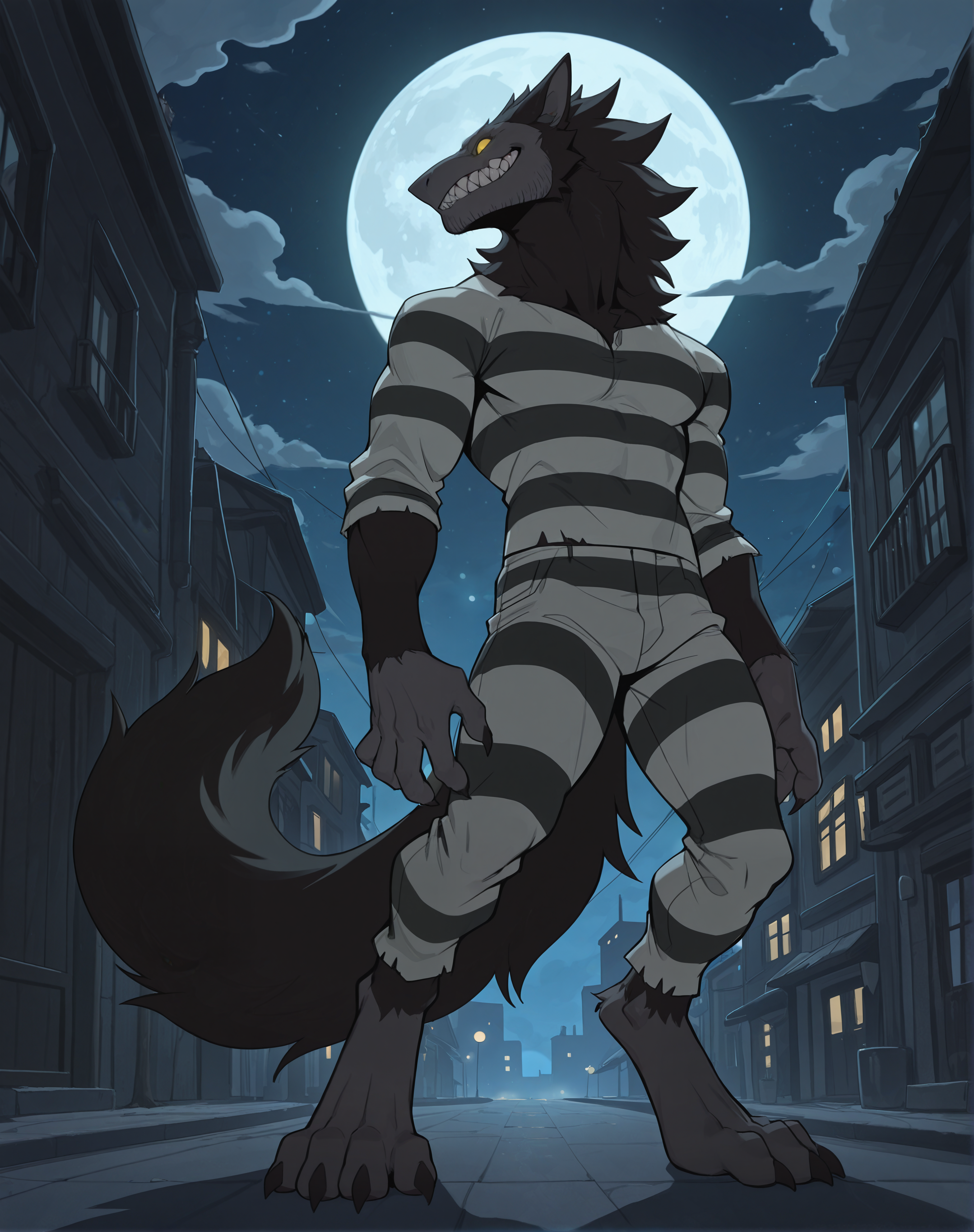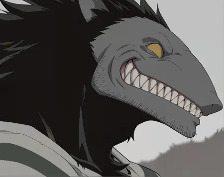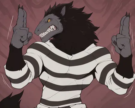 태그: fr33, 날카로운 이빨, 털, 뾰족한 귀, 검은 피부, 넓은 어깨, 넓은 가슴, 발가락 보행, 노란 눈, 두꺼운 목, 발톱, 수염, 꼬리, 옷, 줄무늬, 줄무늬 셔츠, 줄무늬 바지, 홍채 없음, 동공 없음, 벗겨진 옷, 왼쪽 눈 위의 단어 'no future'...