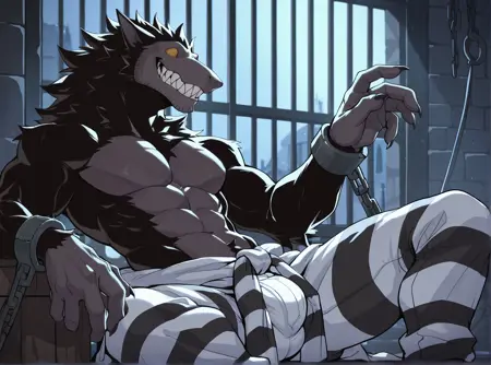 タグ:fr33、鋭い歯、毛皮、尖った耳、黒い肌、広い肩、広い胸、二足歩行、黄色い目、太い首、爪、ひげ、尾、服、縞模様、ストライプシャツ、ストライプパンツ、虹彩なし、瞳孔なし、ズレた服、左目の上に「no future」という言葉)...