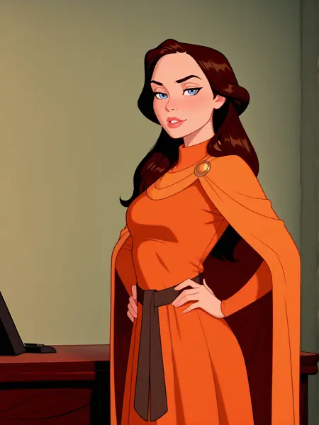 服装1:LadyJulianaIL,1girl,单人,长发,蓝眼睛,棕色头发,长袖,连衣裙,微张的嘴唇,腰带,斗篷,嘴唇,橙色连衣裙,美术讽刺风格,橙色斗篷