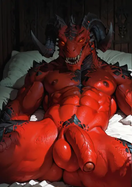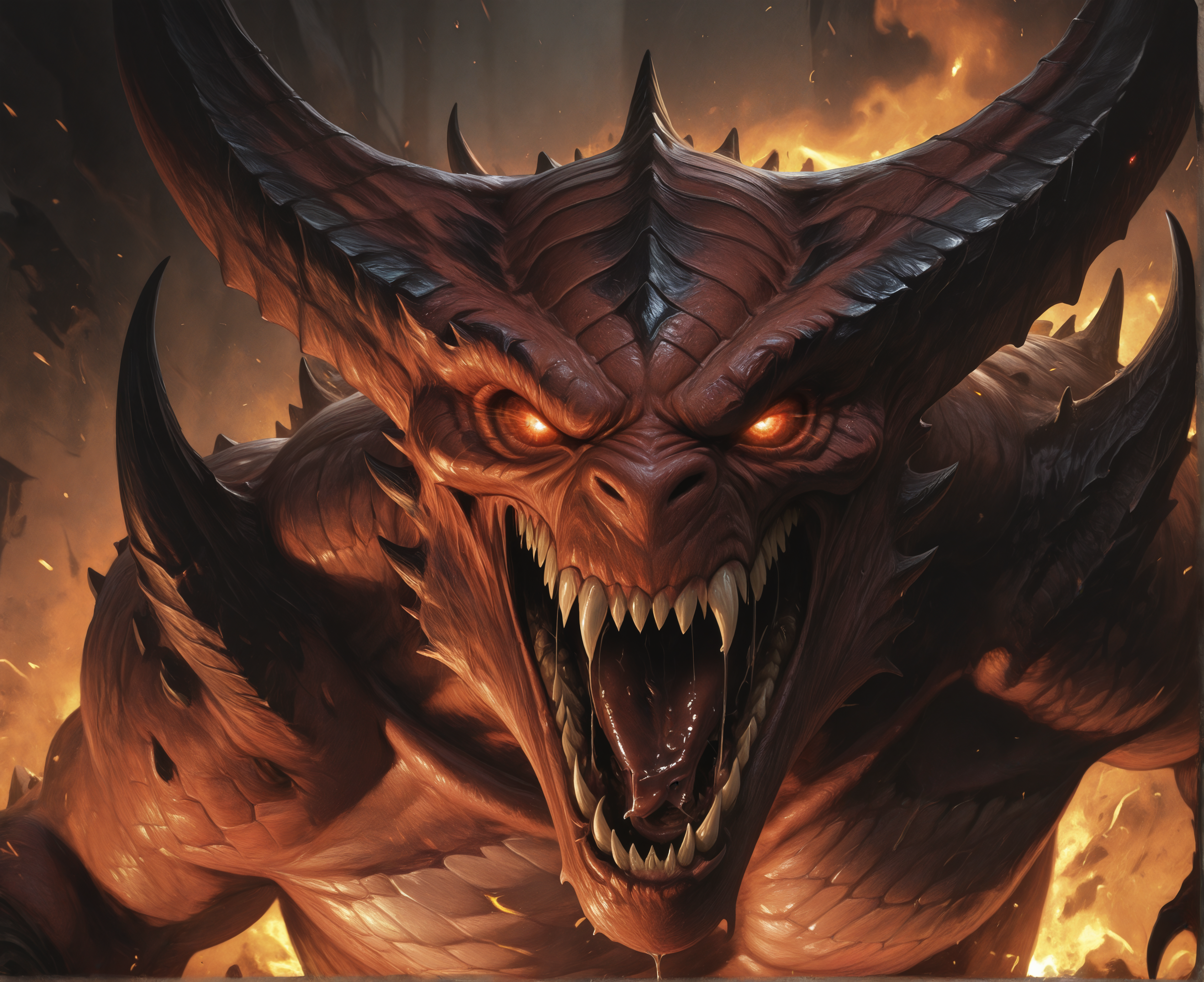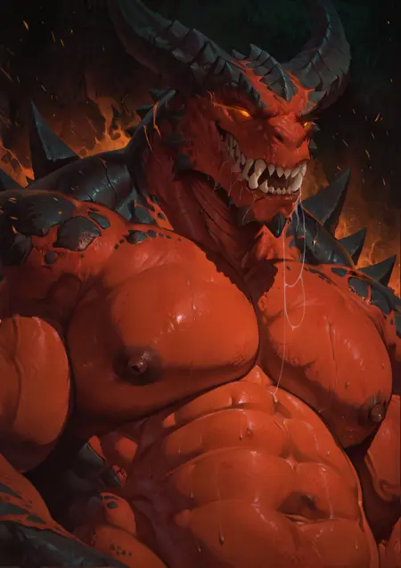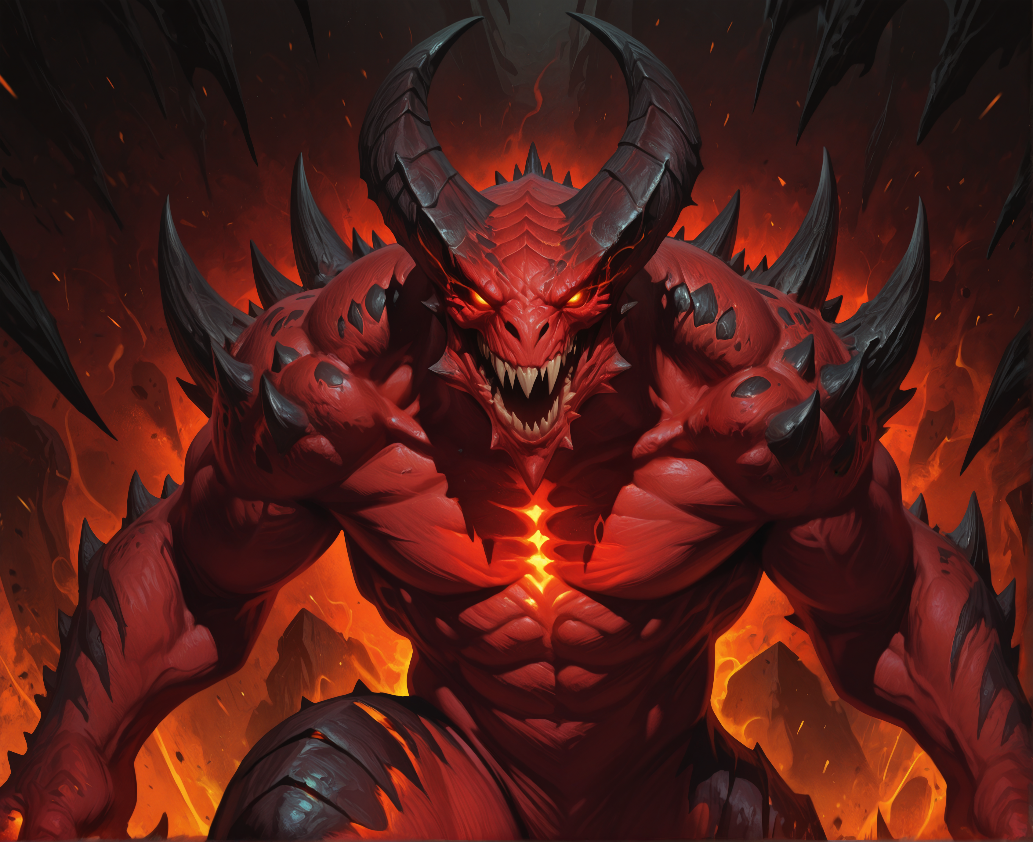 标签:深渊领主,怪物,恶魔,翅膀,角,红色皮肤,爪子,尾巴,尖牙,尖刺,扁平鼻子,趾行性,发光的眼睛,板状鳞片,锋利的下颌,……