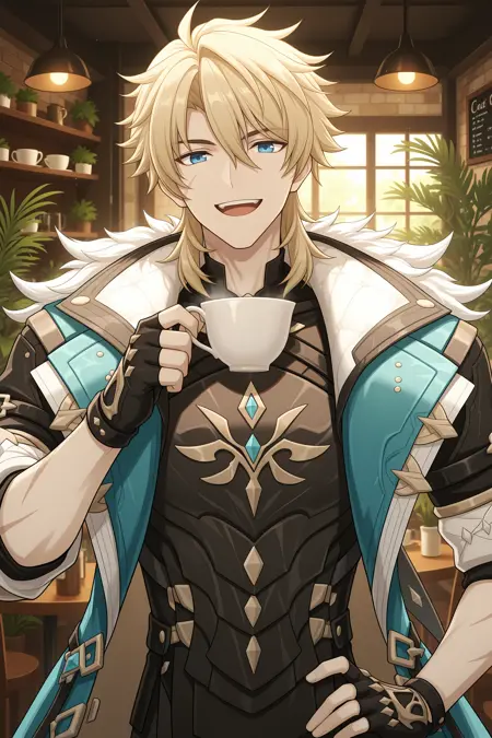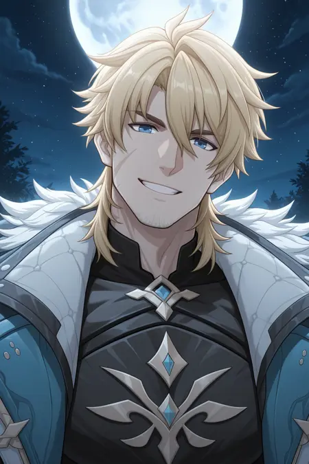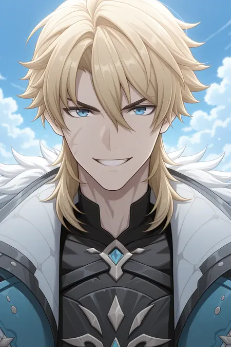 태그: varka_genshin, 금발, 눈 사이의 머리카락, 짧은 헤어, 파란 눈, 볼에 있는 흉터