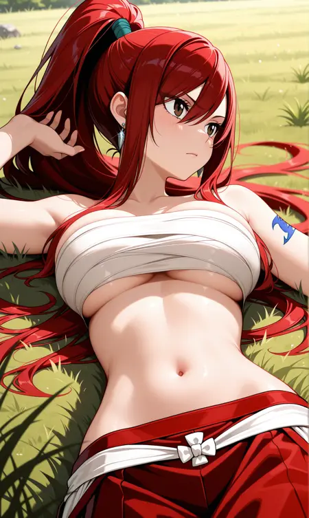 エルザ・スカーレット、茶色の目、赤髪、ポニーテール、片方の目に髪がかかる、長い髪、イヤリング、ジュエリー、腕のタトゥー