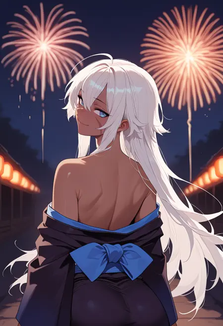 デフォルトの服装: 肌の濃い女性、顔の傷、長い髪、白髪、眉間の髪、アホ毛、青い目、黒いコート、ファー縁取りのコート、開いたコート、長い袖、白いシャツ、襟付きシャツ、ノースリーブシャツ、短めのシャツ、胸のハーネス、アンダーバスト、黒いネクタイ、胸の間のネクタイ、黒いパンツ、破れたパンツ、ヒップベンツ、ブーツ、へそ、胸元、大きな胸