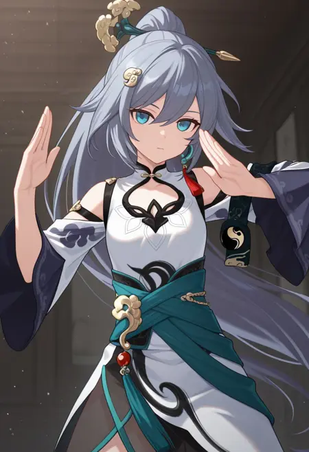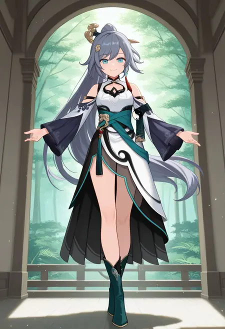 AzuEmpOutfit, 빨간 글자 달린 옥 귀걸이, 금색 머리핀, 검은색과 금색 머리 장식, 흑백 상의, 가슴 노출, 티올색 허리 띠, 정교한 흰색과 남색 소매, 금색 테두리가 있는 티올색 소매 장식, 티올색 테두리가 있는 긴 흑백 치마, 옆 슬릿, 반투명 치마 끝, 금색 장식이 있는 검은 팔찌, 음양 기호가 있는 남색 리본, 금색 테두리가 있는 흰색과 검은색 부츠, 금색 테두리가 있는 티올색 부츠 장식, 다리 노출