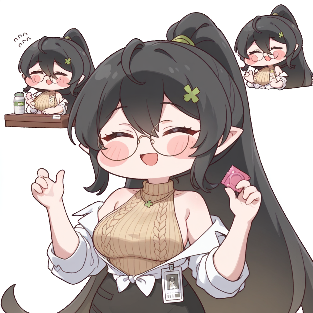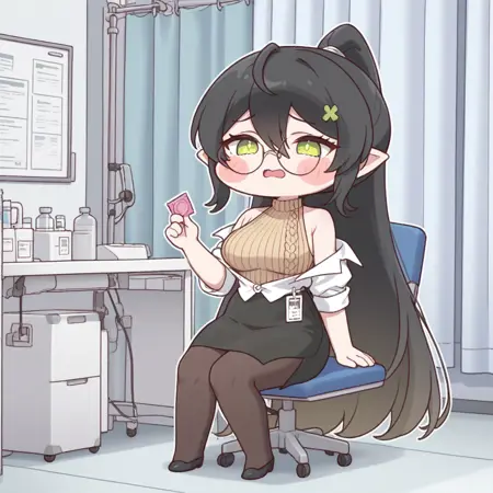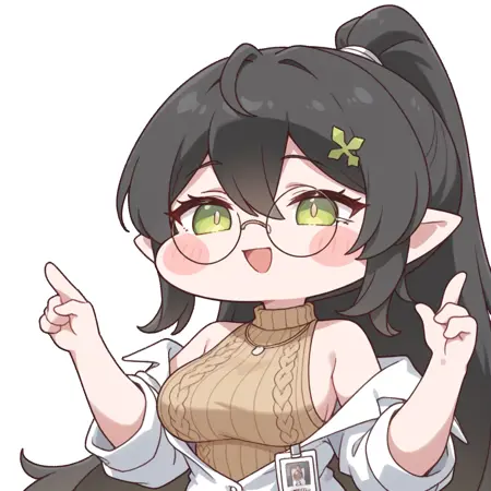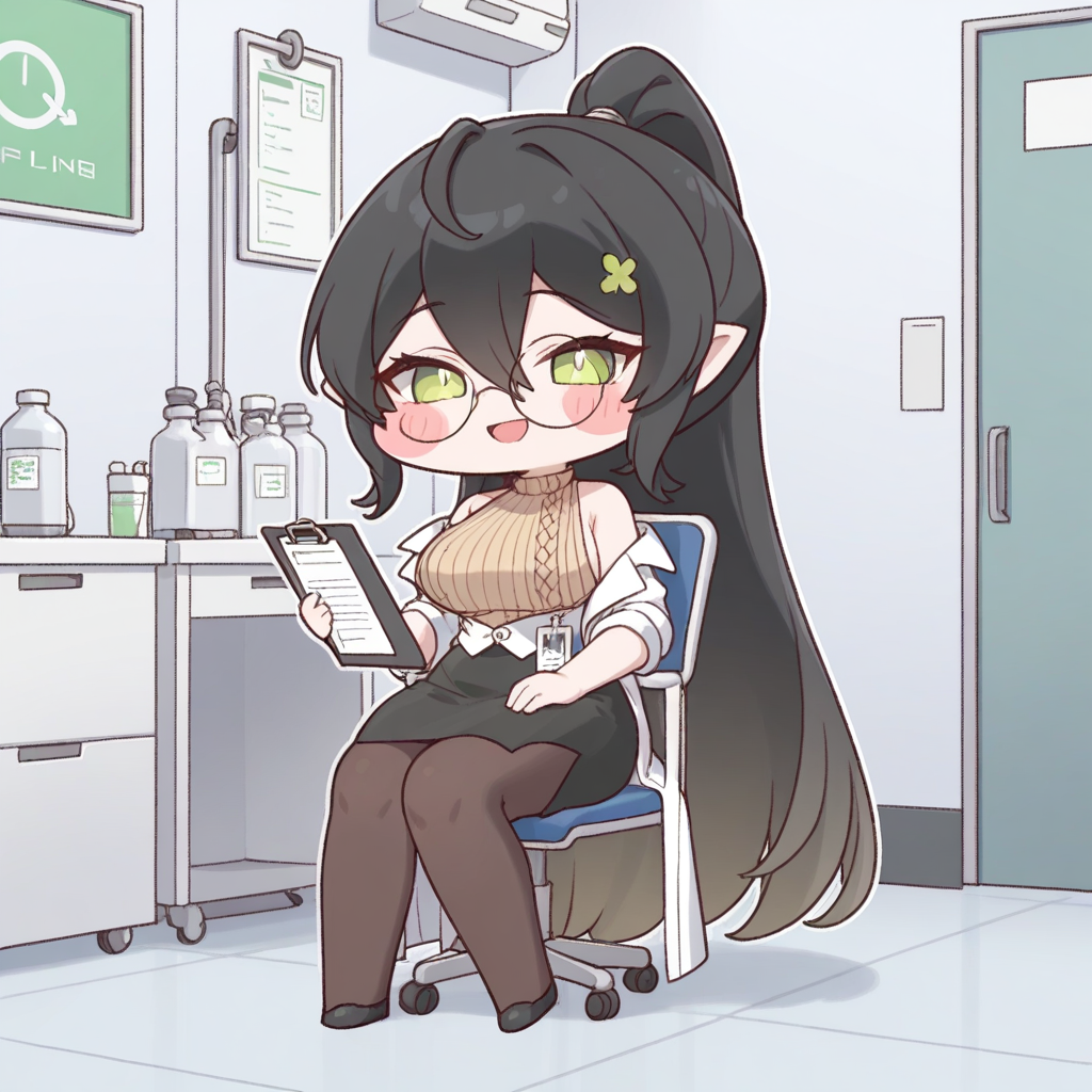 tag : 1girl, black hair, green eyes, pantyhose, sleeveless sweater, id card, round eyewear, ponytail, ribbed sweater, black skirt, very long hair, large breasts, black footwear, hair ornament, pointy ears, pencil skirt, off shoulder, blush stickers, chibi,
