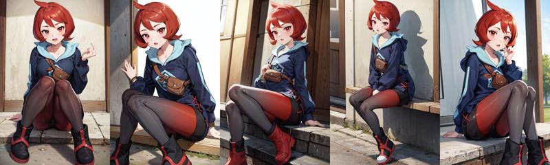 arezu \(宝可梦\),短发,刘海,连帽衫,渐变衣服,长袖,棕色包,短裤,丝袜,渐变腿部服饰,靴子