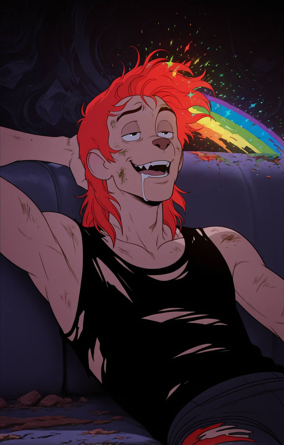 Positive Prompt: omar_rar, red_hair, black_eyes, green jacket, short_sleeves, green pants, black undershirt, furry_male human_hybrid