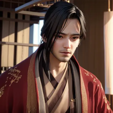 a man with a red jacket and a black hat and a red jacket and a red and white robe, (1boy:0.782), (architecture:0.810), (blurry:0.568), (bookshelf:0.895), (brown eyes:0.620), (brown hair:0.521), (chinese clothes:0.812), (closed mouth:0.511), (east asian architecture:0.719), (facial hair:0.631), (hanfu:0.771), (indoors:0.636), (japanese clothes:0.599), (long hair:0.576), (looking at viewer:0.622), (male focus:0.812), (solo:0.859), (upper body:0.787)