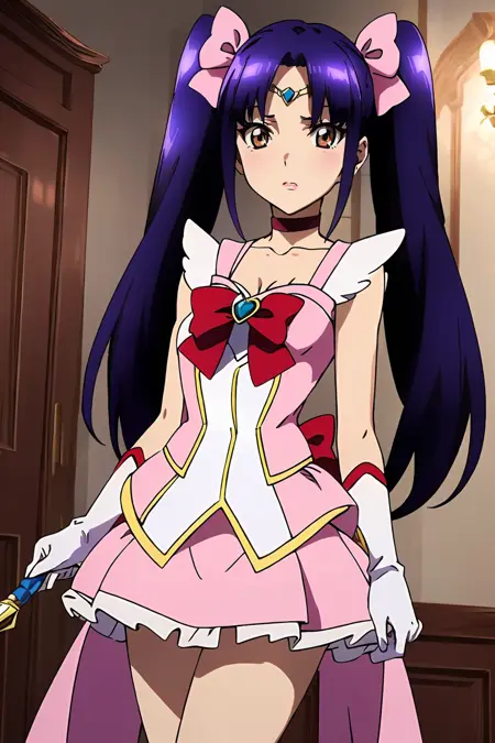 魔法少女,magical girl,choker,dress,bow,pink dress,wand,hair bow,jewelry,pink choker,ribbon,brooch,cosplay,red bow,white gloves,