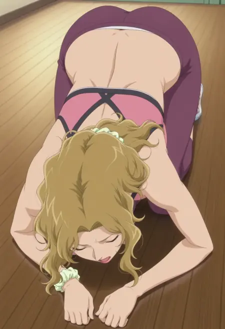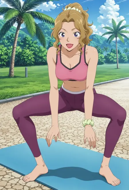 ponytail,scrunchie,navel,pink sports bra,cleavage,purple yoga pants,barefoot,