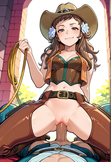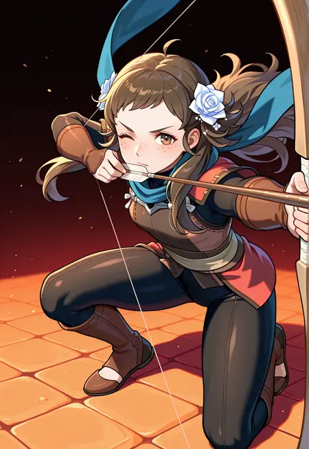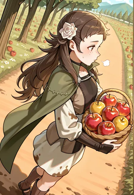 Mozu \(Fire Emblem\), Brown hair, flower in hair, white rose in hair, hair ornament, white flower, brown eyes, brown tunic, brown cape, green cape, white skirt, brown boots, long hair, sidelocks, freckles, white belt, long sleeves, gauntlets,
