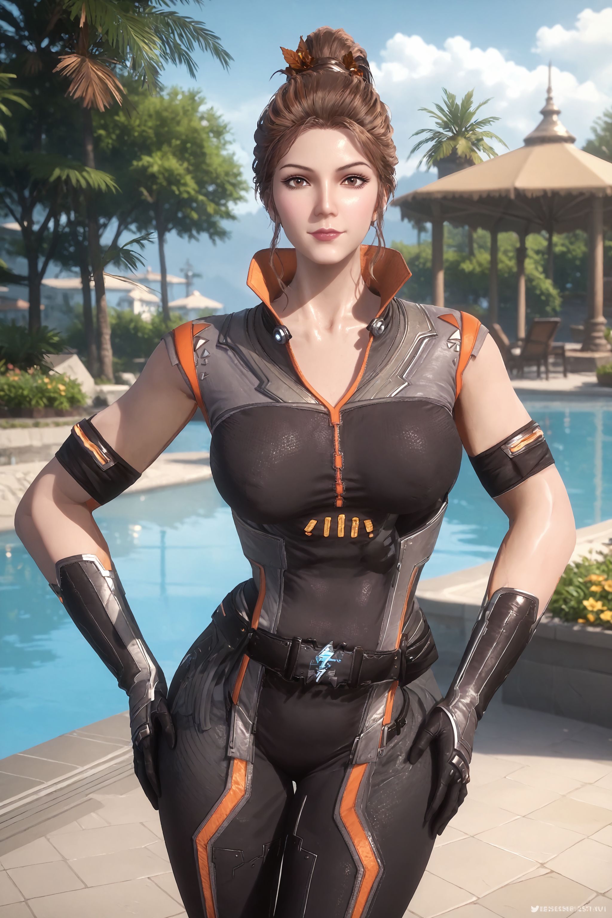 1girl, solo, gloves, brown hair, black gloves, brown eyes, bodysuit