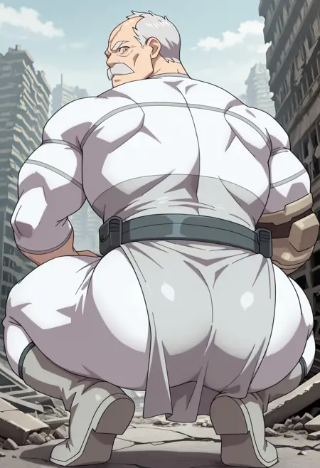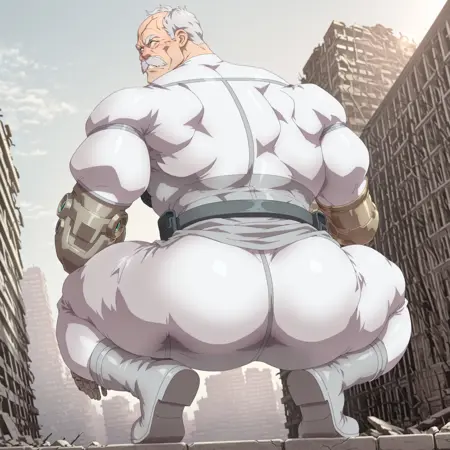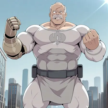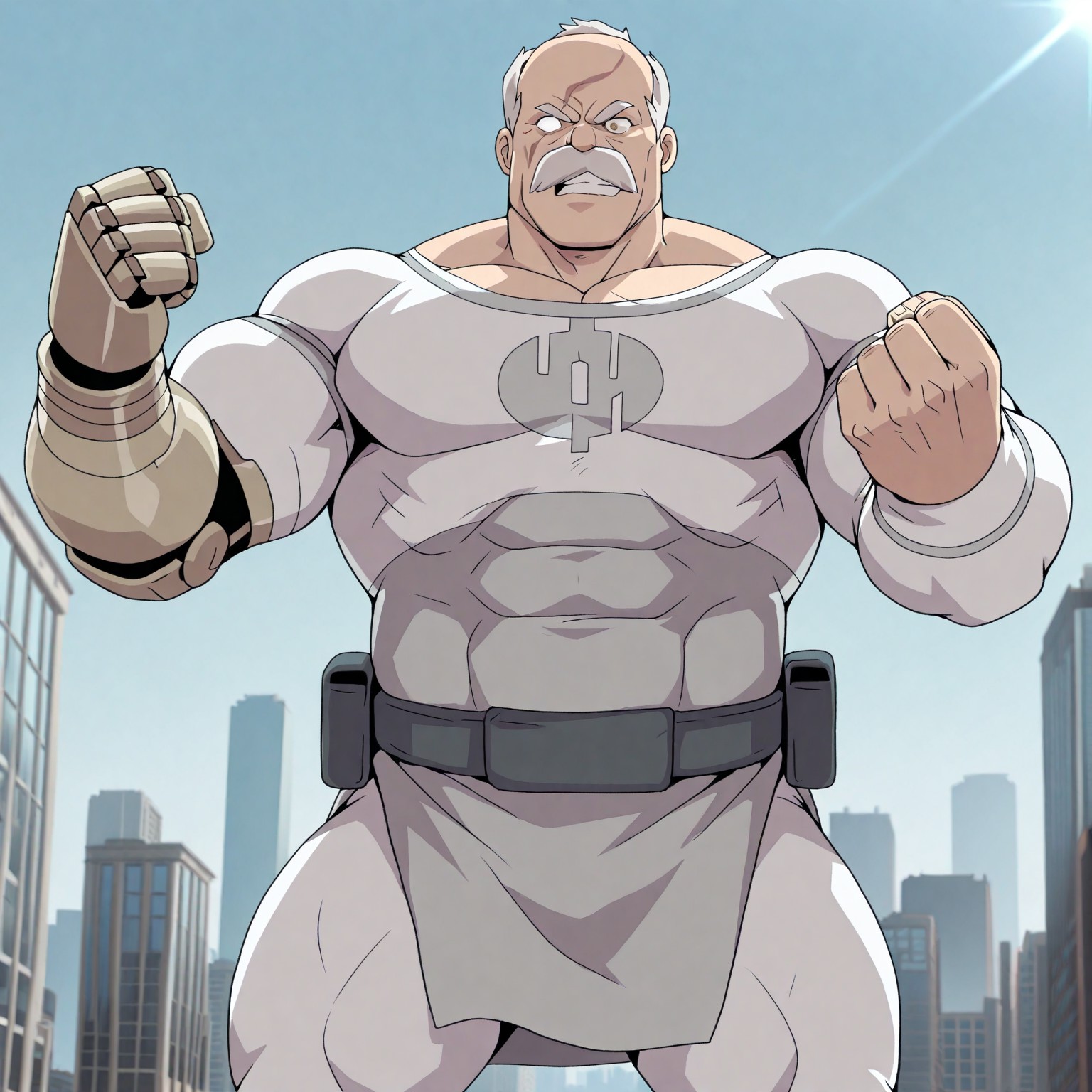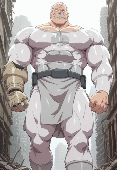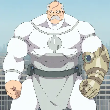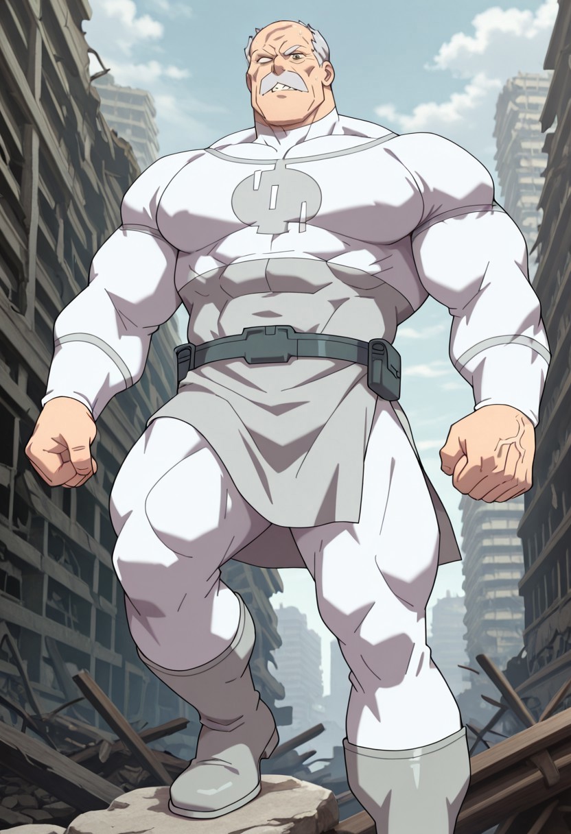 Conquest, solo, older male, old, wrinkles, mustache, crooked teeth, white hair, white mustache, thick white eyebrows, horseshoe hairline, bald on top of head, muscular, bara, white and grey bodysuit, logo on bodysuit, skirt, Conquest, old man, Right eye scar, Right Eye blind eye, yellow eye, single mechanical arm, grey boots,
