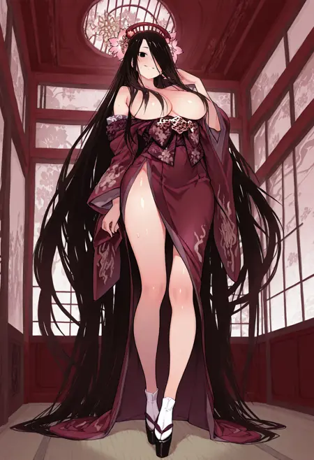 일본식 옷, 키모노, 어깨 드러냄, 드러난 어깨, 플랫폼 신발, 오코보, 머리 장신구, 머리꽃